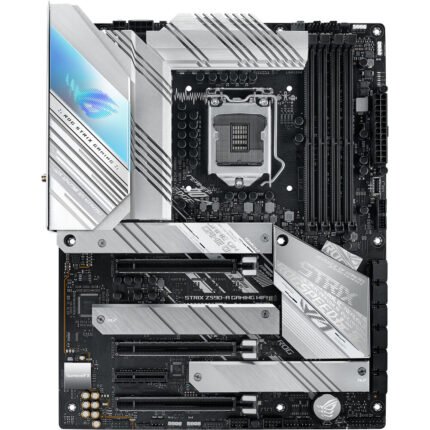 ROG STRIX Z590-A GAMING WIFI LGA 1200 ATX motherboard with PCIe 4.0, 14+2 teamed power stages, Two-Way AI Noise Cancelation, AI Overclocking, AI Cooling, AI Networking, WiFi 6 (802.11ax), Intel® 2.5 Gb Ethernet, three M.2 slots with heatsinks, USB 3.2 Gen 2x2 USB Type-C®, SATA and Aura Sync RGB lighting